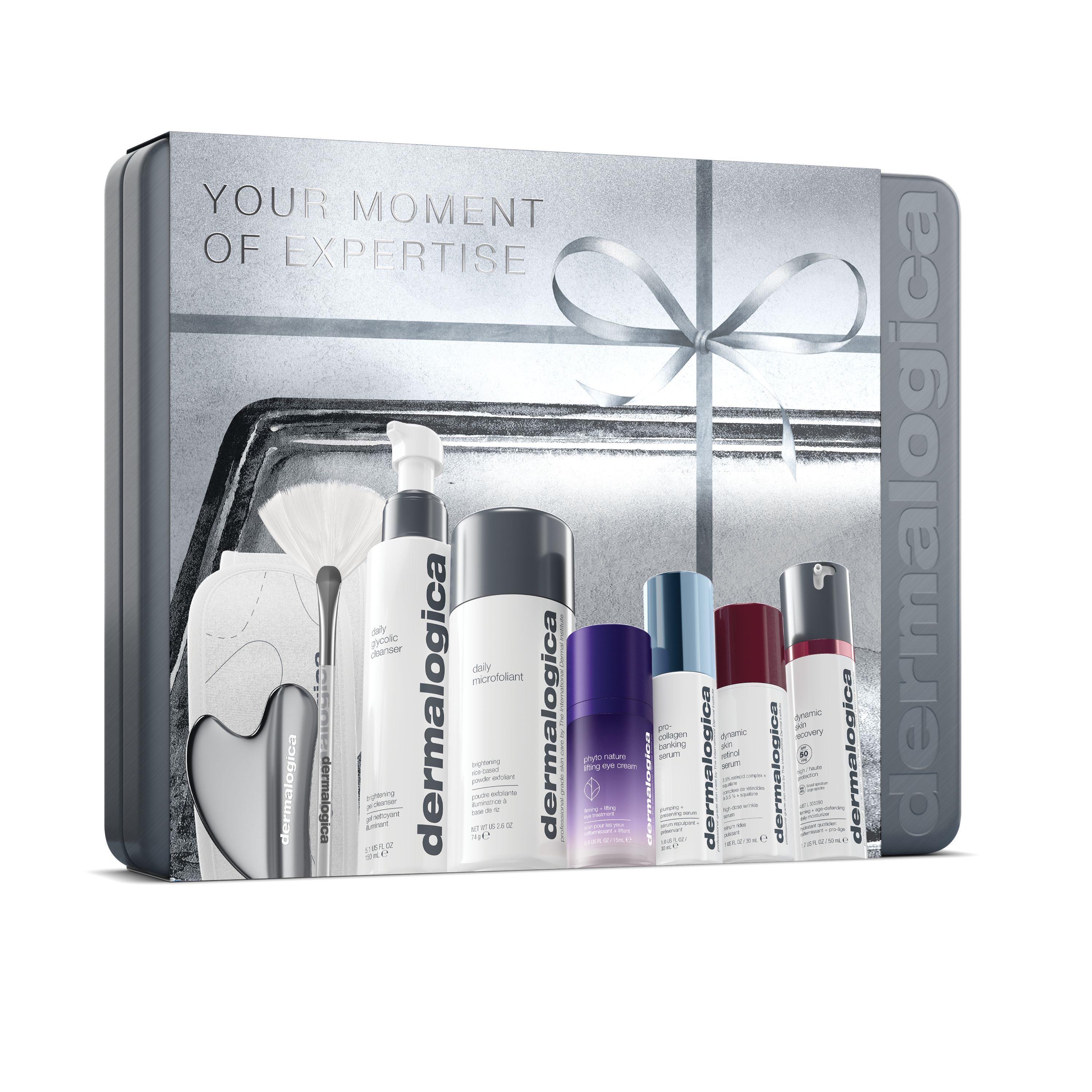 There’s a simple joy in setting goals for the New Year — the spark of possibility, the thrill of imagining the expert you’re about to become. Reach for an expert-level skin care routine: this do-it-all skin treatment features Daily Glycolic Cleanser, Daily Microfoliant, Phyto Nature Lifting Eye Cream, Pro-Collagen Banking Serum, Dynamic Skin Retinol Serum, and Dynamic Skin Recovery SPF 50 for brighter, smoother, firmer skin. Upgrade your at-home experience with a professional touch: Dermalogica headband, fan brush, and Gua Sha deliver elevated results. For full treatment directions and three easy steps for using the Gua Sha, see insert inside.